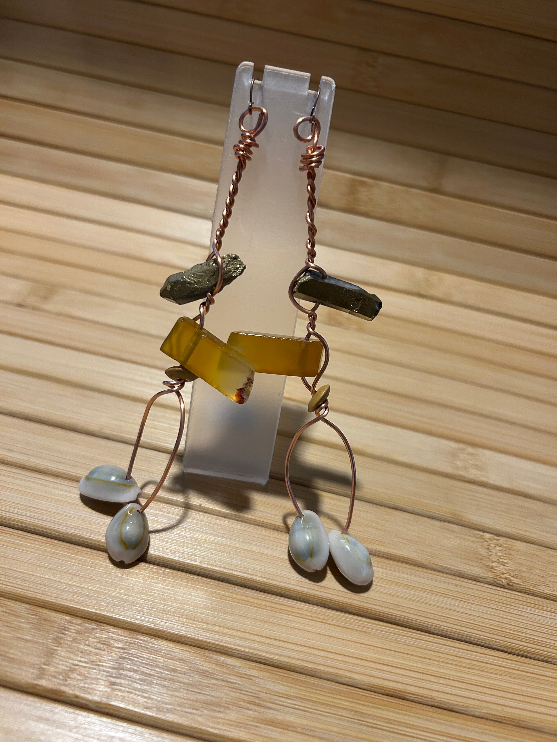 Twisted copper stems cradle raw stone elements, warm amber-toned slabs, and soft shell drops, creating a design that honors nature in its untamed form. Wild Alchemy earrings symbolize transformation, grounding, and sacred balance—crafted for those who embrace their raw, authentic power.